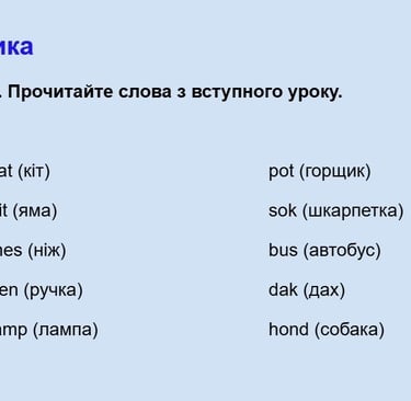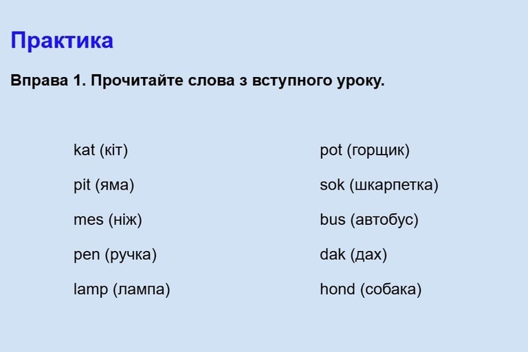 Lees de volgende woorden hardop. Прочитайте наступні слова вголос.