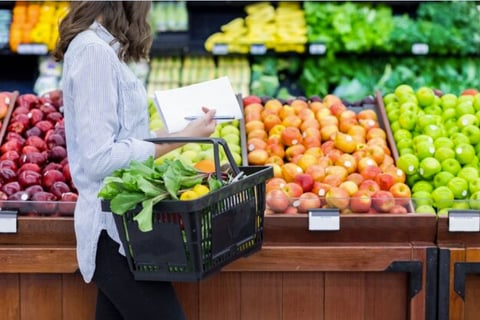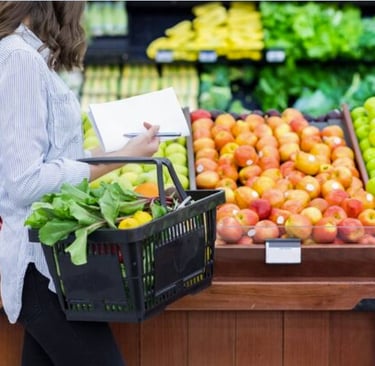 naar de groente en kiest tomaten en komkommers. Bij de kassa betaalt ze